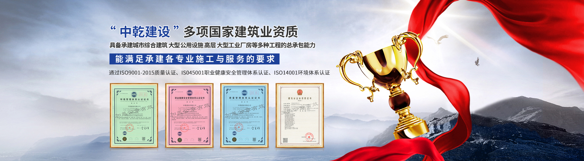 中乾建設有限公司成立于2016年,是具有多項國家建筑業資質的企業,注冊資金11800萬元。公司經營范圍以工業與民用建筑為主,集建筑、電力、機電、水利水電、公路、石油化工工程施工總承包;防腐防水保溫、消防設施、建筑裝修裝飾、鋼結構、古建筑、公路路面工程、公路路基工程、環保工程承包;模板腳手架、施工勞務等業務于一體,具備承建城市綜合建筑、大型公用設施、高層、大型工業廠房等多種工程的總承包能力。  .........
